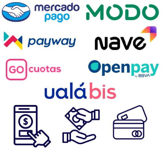 Mercado Pago, MODO, Openpay, Nave, GOcuotas, Ualá Bis, Payway, Efectivo, Transferencia o personalizalo con lo que vos quieras que diga.